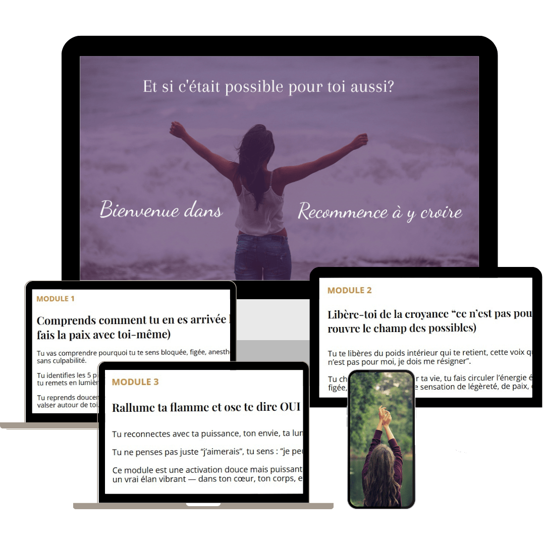 Recommence à y croire te donne un espace clair, doux et transformateur pour retrouver l’élan, rallumer ta flamme, et remettre du mouvement là où tout te semble figé.